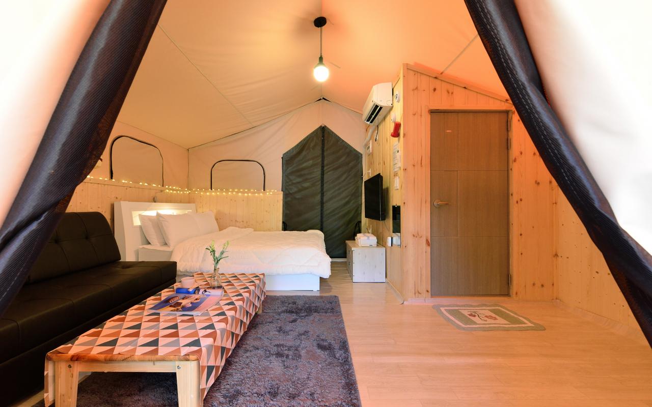 그라티아 글램핑은 숲속에 위치한 조용하고 아늑한 글램핑장으로, 글램핑과 펜션의 장점을 모두 갖춘 형태입니다. 전 객실에 독립 화장실이 설치되어 있고, 침구 역시 호텔 수준으로 깔끔하게 정돈되어 있습니다. 상천역과 가평역에서 가깝고, 조용한 휴식을 원하는 연인이나 친구 단위 여행객에게 적합합니다.