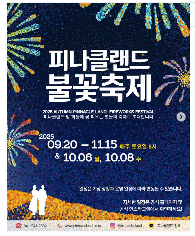 출처 : 피나클랜드 공식 홈페이지 ※ 불꽃 일정·시간은 기상·안전·현장 상황으로 변경/취소될 수 있습니다. 방문 직전 공식 공지 재확인 필수.